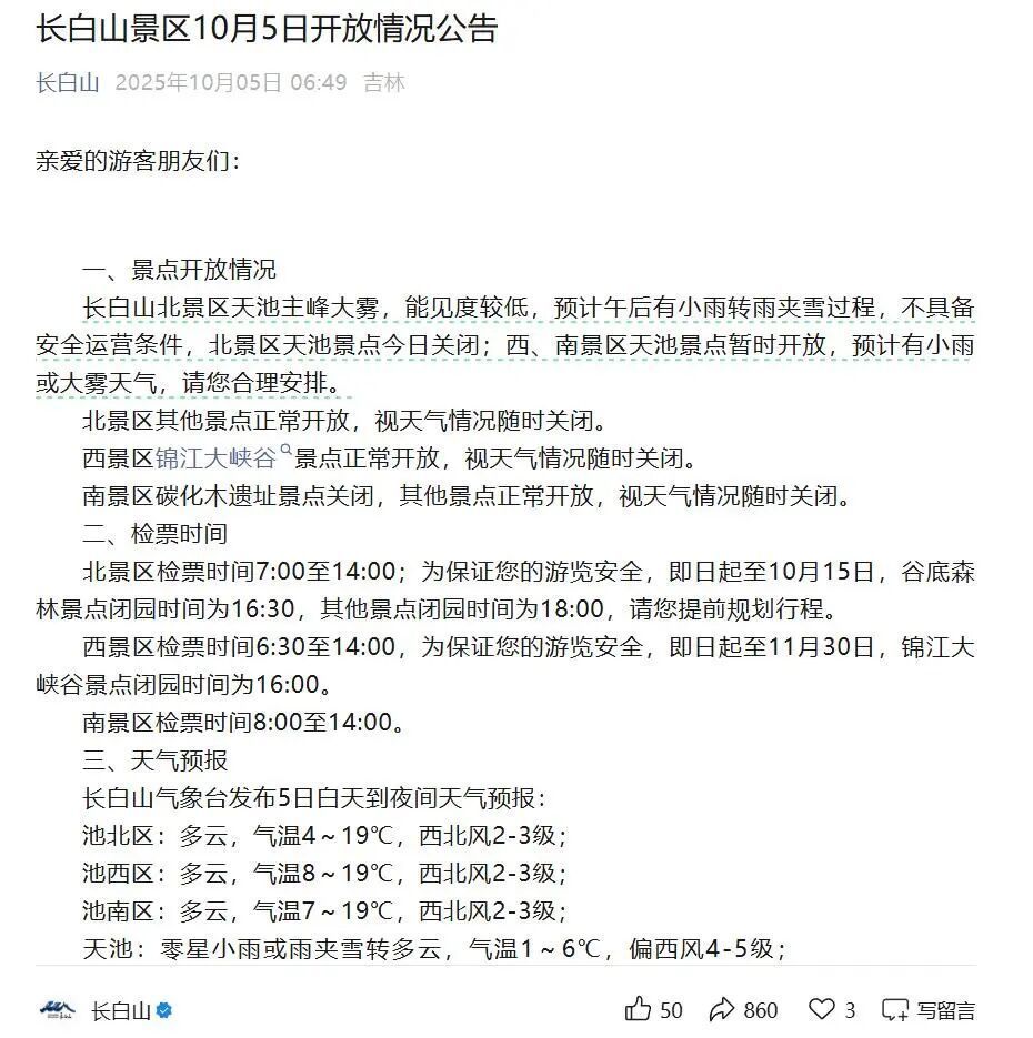 据长白山景区官方公众号10月5日发布的开放情况公告,长白山北景区天池主峰大雾,能见度较低,预计午后有小雨转雨夹雪过程,不具备安全运营条件,北景区天池景点今日关闭;西、南景区天池景点暂时开放,预计有小雨或大雾天气。北景区其他景点正常开放,视天气情况随时关闭。