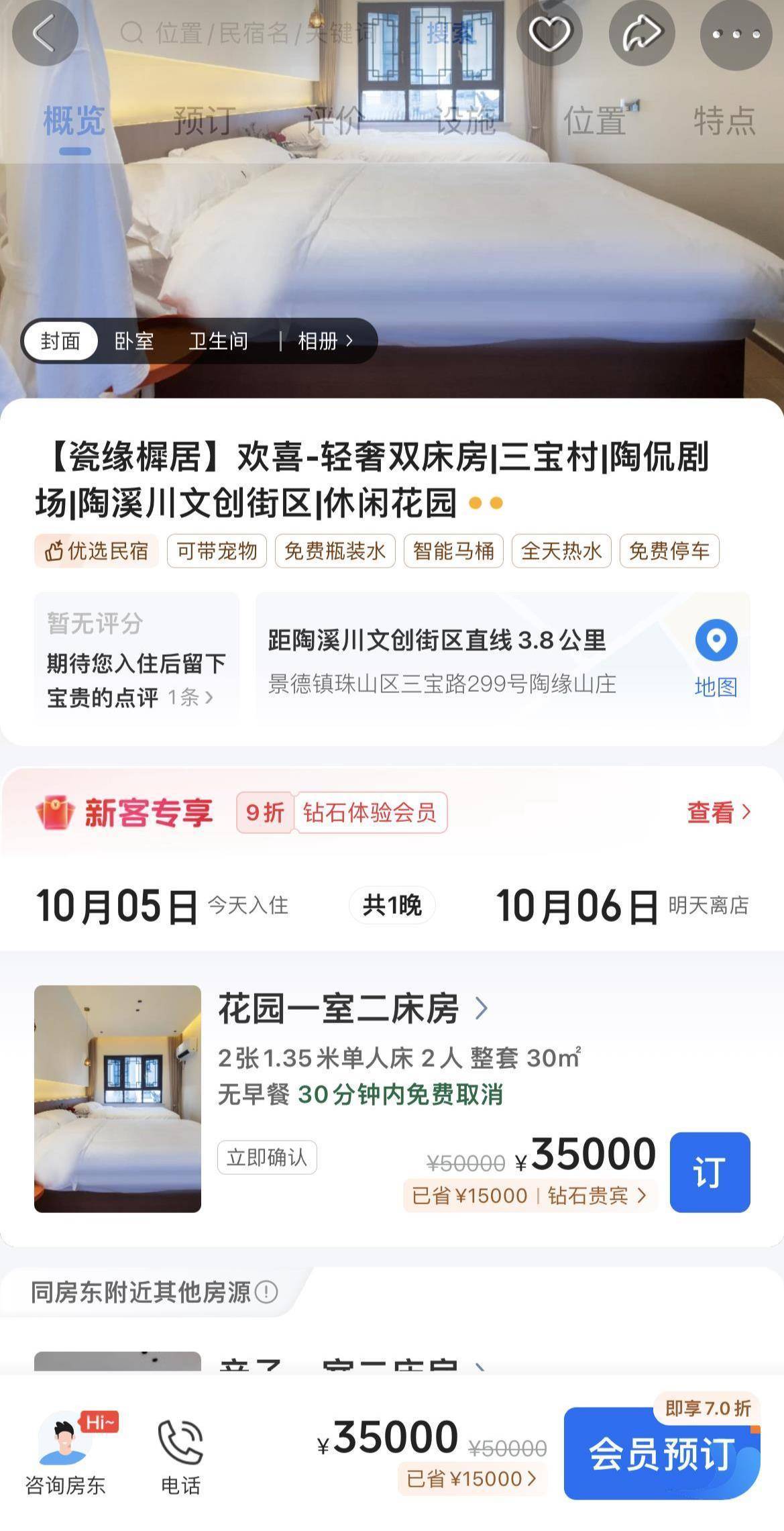 10月5日,极目新闻记者在该APP上查询到这家名为瓷缘樨居的民宿,选择预订10月5日入住。页面显示,该民宿一间花园一室二床房,原价每晚50000元,会员优惠后价格为每晚35000元。