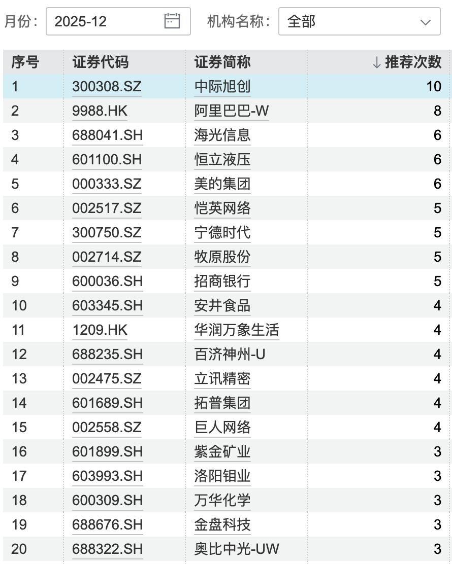 Wind统计显示,截至12月3日,券商12月金股共推荐了226只A股(去重)。其中前20名多数为大家耳熟能详的公司(下图)。