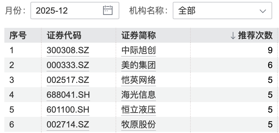 具体到个股来看,不同机构共同推荐的金股主要包括以下几个,中际旭创、美的集团、恺英网络、海光信息、恒立液压、牧原股份,这些公司都有5次以上的推荐。
